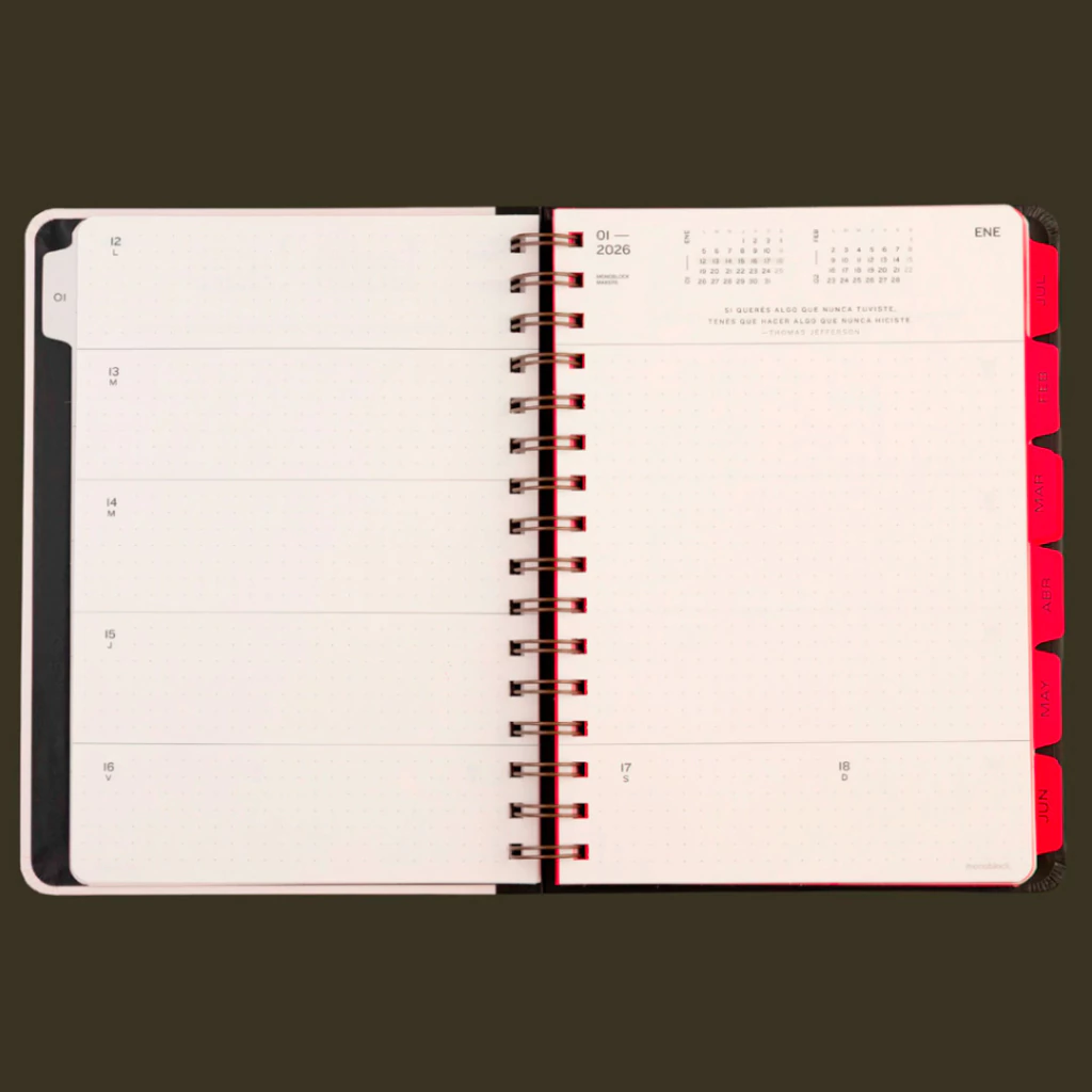 Su diseño moderno y atractivo inspira a mirar hacia el futuro con optimismo, mientras que su estructura monoblock facilita la escritura y el manejo diario. Perfecta para estudiantes, profesionales y cualquier persona que busque mantener sus compromisos bajo control sin perder elegancia.
