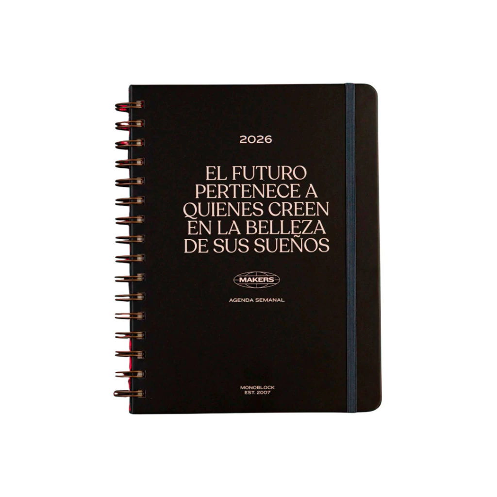 Descubrí la Agenda 2026 Monoblock Makers - Futuro, la compañera ideal para organizar tu año con estilo y funcionalidad. Con un práctico formato semanal de 22x16 cm, esta agenda te ofrece el espacio justo para planificar cada día de manera clara y eficiente.
