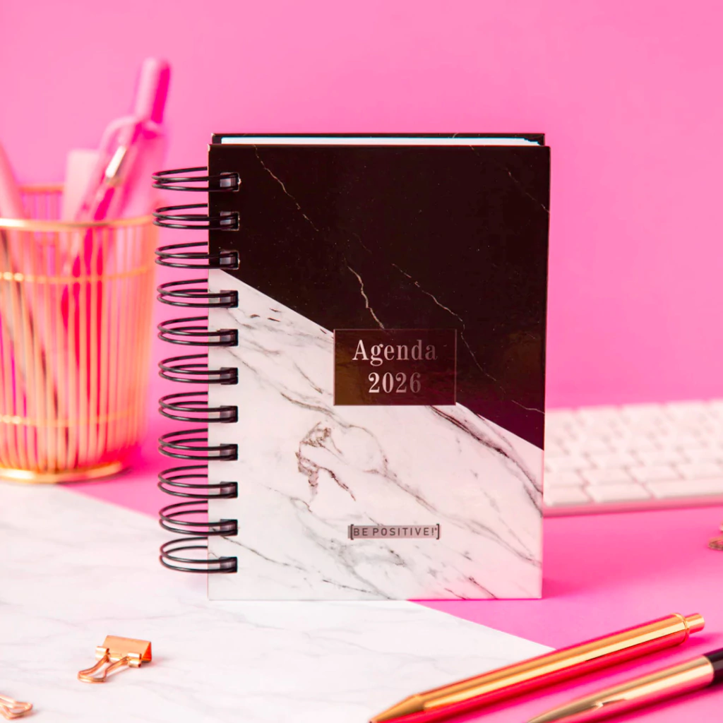 Descubrí la Agenda 2026 Punto Cero - Mármol Blanco y Negro - Diaria N6 Be Positive, el aliado perfecto para planificar cada día con estilo y energía positiva. Su diseño elegante en mármol blanco y negro aporta un toque de sofisticación que combina con cualquier espacio.