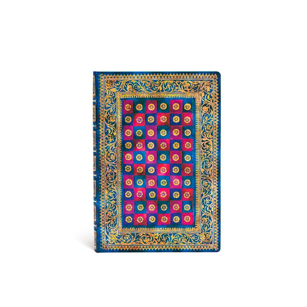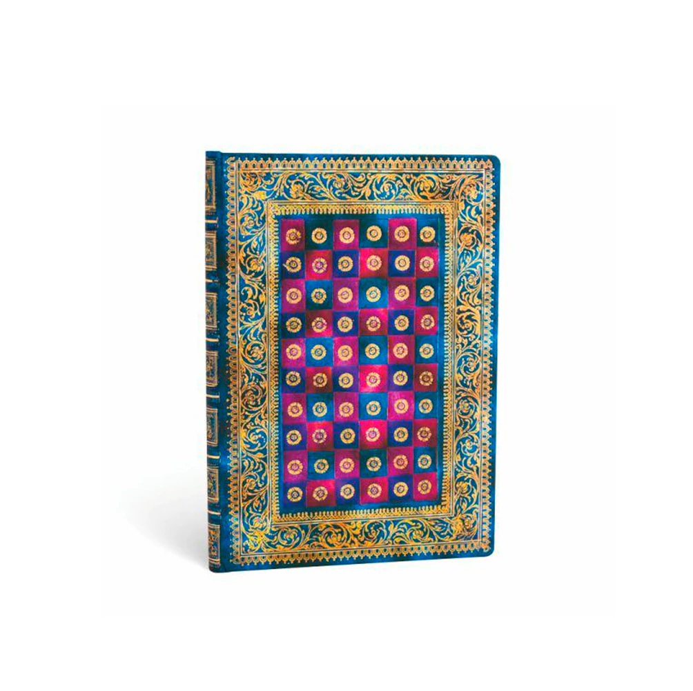 Venecia es una delicia para la vista, desde el alba hasta el atardecer. Esta cubierta, inspirada en una encuadernación italiana del siglo XVII, recrea la paleta de colores veneciana. El diseño Celeste refleja la idea renacentista de la renovación cultural, ya que reproduce una encuadernación antigua con técnicas modernas.